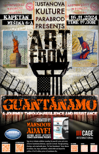 Pozivamo vas na otvaranje izložbe: "Art from Guantanamo: A Journey Through Resilience and Resistance", koje će se održati u subotu, 16.11.2024. u 19.00h, u Ustanovi kulture Parobrod, Kapetan Mišina 6-a.